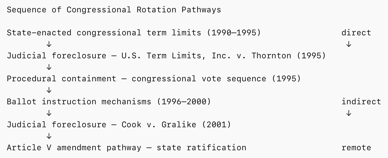 State voters first adopted congressional rotation provisions through initiative and constitutional amendment. Judicial review then foreclosed those eligibility architectures. Congress subsequently considered constitutional amendments establishing term limits but did so in a manner that prevented any amendment proposal from advancing to the states through the Article V process. Activity then shifted to ballot-based electoral signaling adopted by several states before the Supreme Court later addressed those mechanisms.