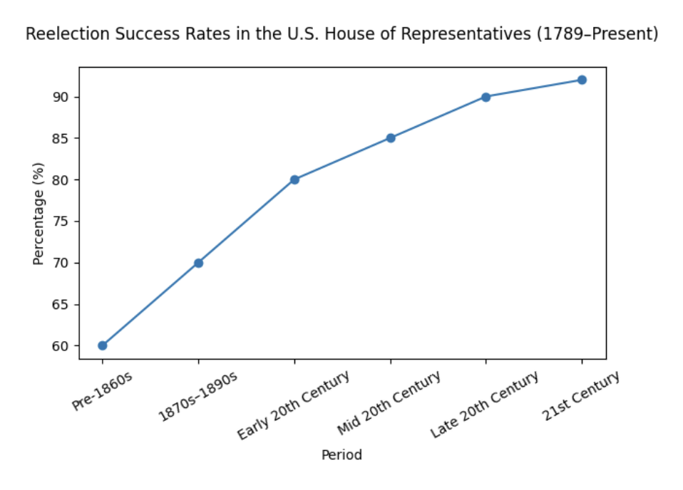 In the 19th century, reelection outcomes were more variable, and incumbents faced higher rates of defeat. Over time, reelection success became more consistent. In the modern period, incumbents are returned to office at high rates across most election cycles.